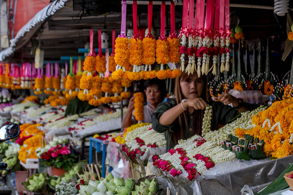 Here you also find the ready made flowers arrangement sold in the temples as offerings, the fragrant jasmine wreaths both sold in the temples as offerings and sold at the traffic lights as air improvers for the cars.