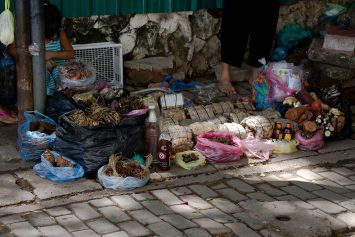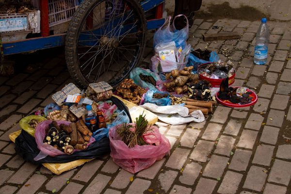 Natural remedies sold on the sidewalk in Vientiane.