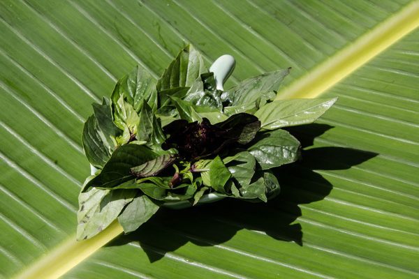 - Pull the leaves off the stems of the Thai sweet basil, and arrange them on a small plate, so they are easy to use.