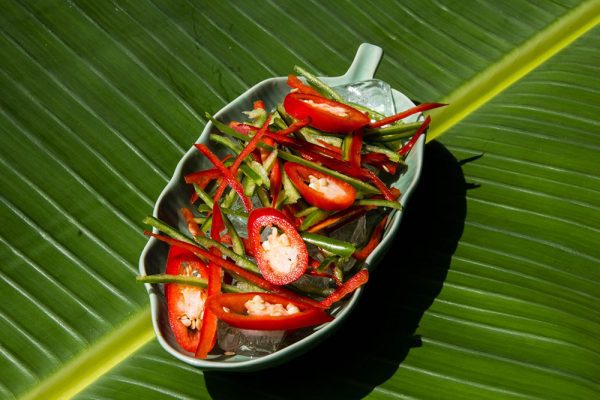 - The chilies are both used for taste and also to garnish the dish. So cut the chillies both in slices and in long thin strips. After cutting the chilies place them in iced water until you have to use them. In that way they will stay crisp.