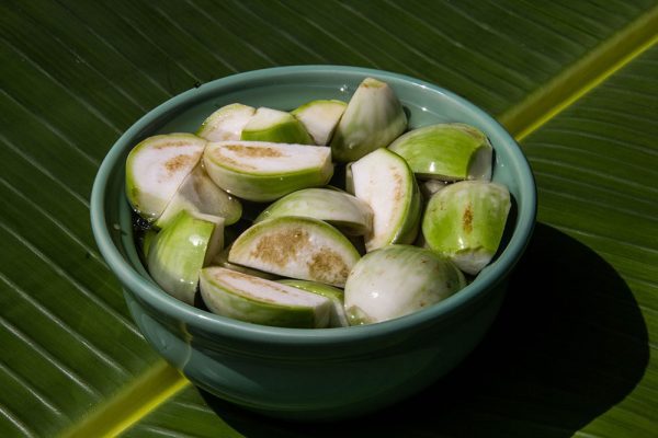 - Cut the Thai egg plant in 4 as shown in the picture. Place the pieces in a bowl full of water until you use them. If they are not placed in water they will turn black.