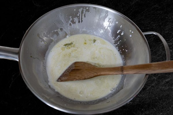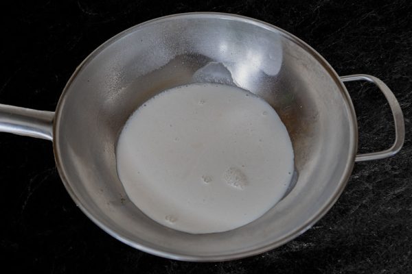 - Heat the frying pan and pour in half of the coconut milk.