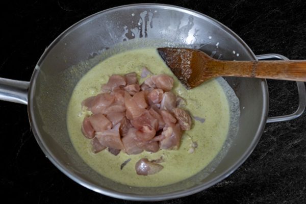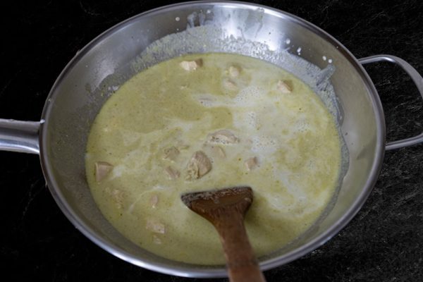 - Let the chicken simmer until it is well done and add the last of the coconut milk.