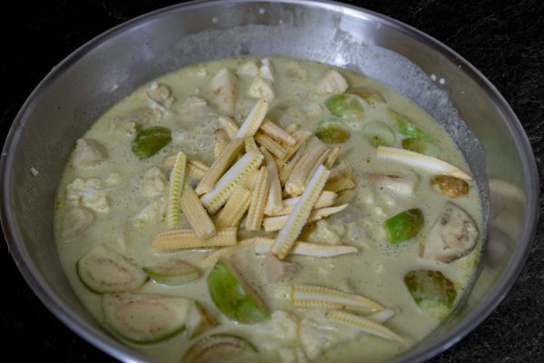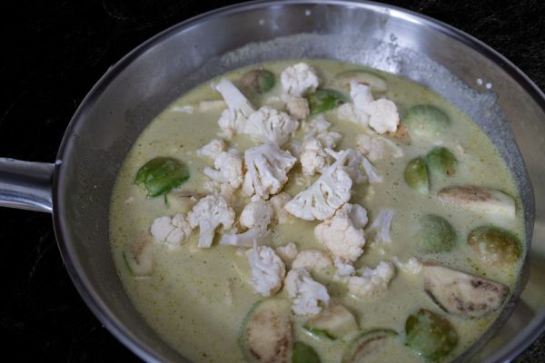 - When the coconut milk starts to boil add the green curry paste. Start adding a little in order not to get too spicy.