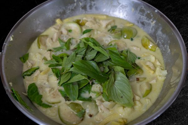 - Add the Thai sweet basil, keep a little of the leaves for garnish. Stir it for 3-4 minutes. If the curry is too dry add some of the soup stock/water. You can also add soup stock/bouillon cube to get more taste.You can adjust the thickness of the curry by boiling it down. If you want the curry more spicy add some more curry pase. Season with salt and sugar.