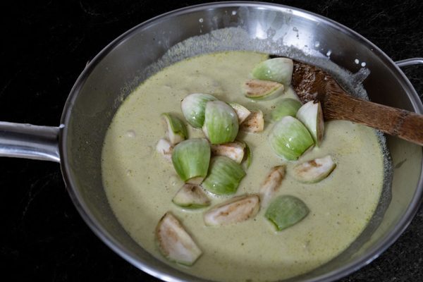 - Then add the Thai eggplant, and stir until it is cooked.