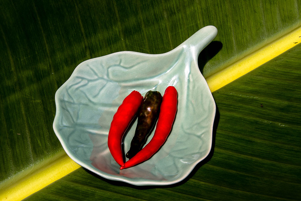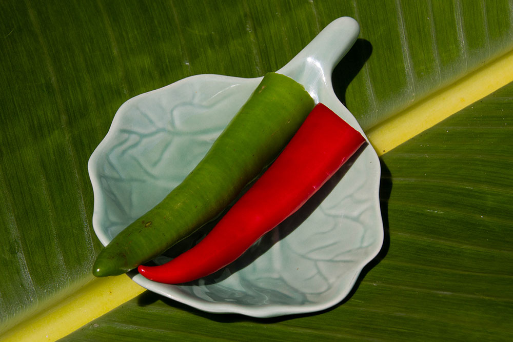 The large chili and fresh peppercorns are only used as a garnish. The amount of small chilies determines how spicy the dish will be.
