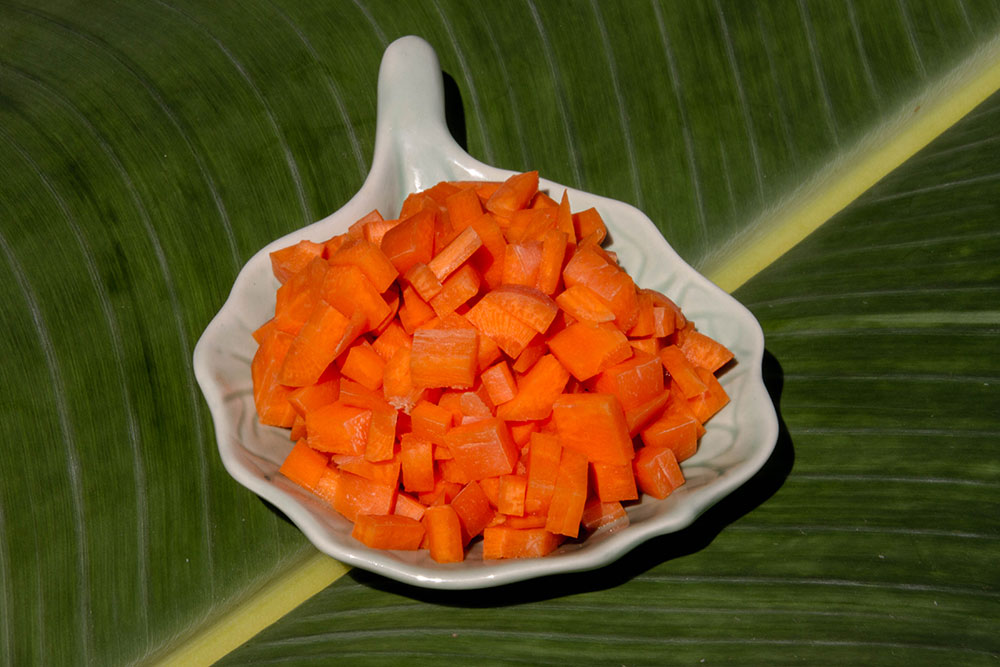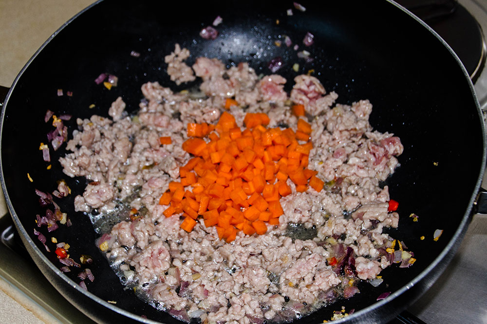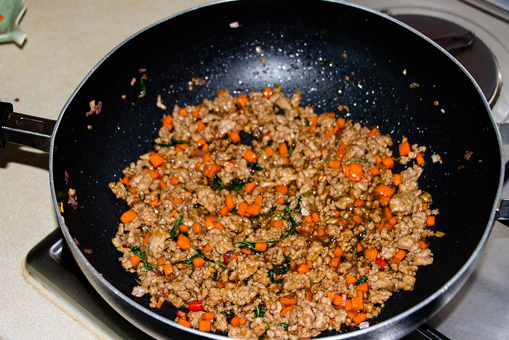 Although it’s not original, I’ve added some carrots to this version of Pad Krapow Moo. You can also choose other extra vegetables, depending on what you like.