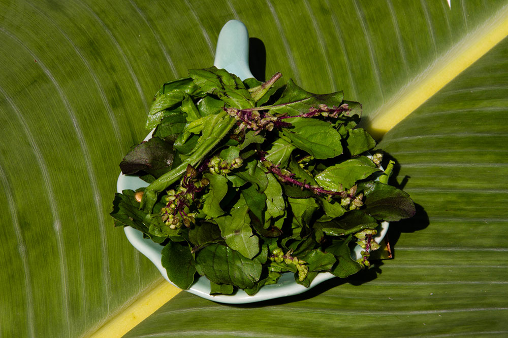 Add the basil leaf, and season with salt, sugar, and sweet soy sauce, and you can add more soup stock and let it boil down if you want more taste. Add more of the small chilies if you want your dish hotter.
