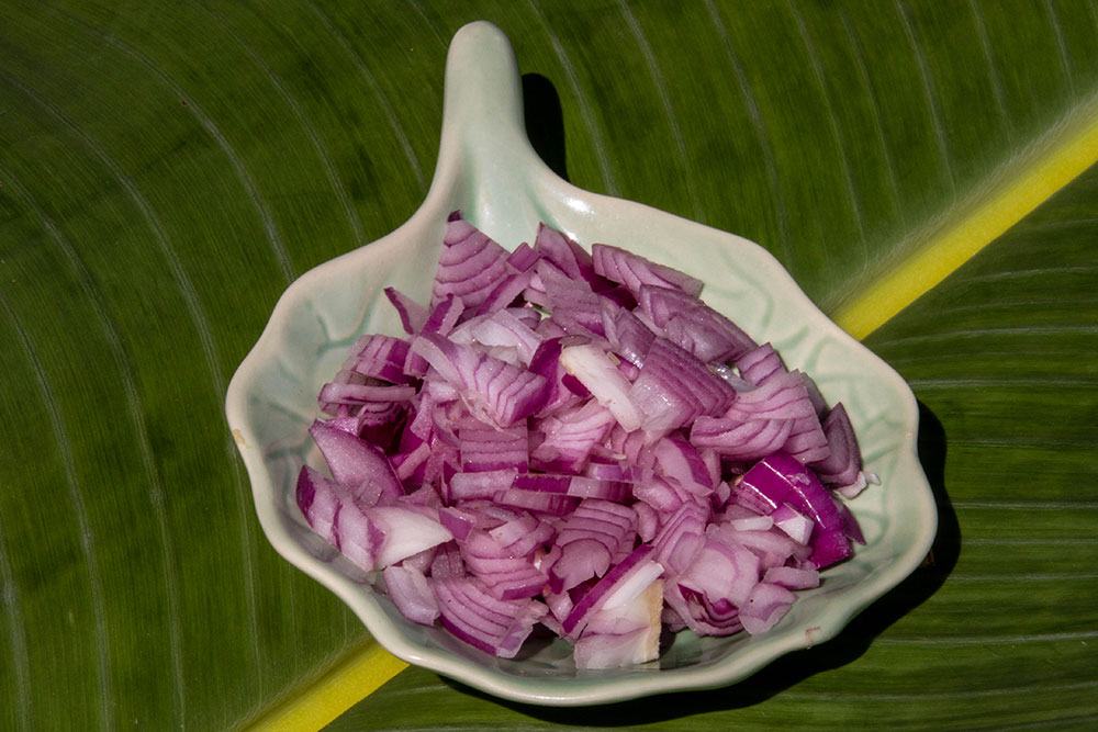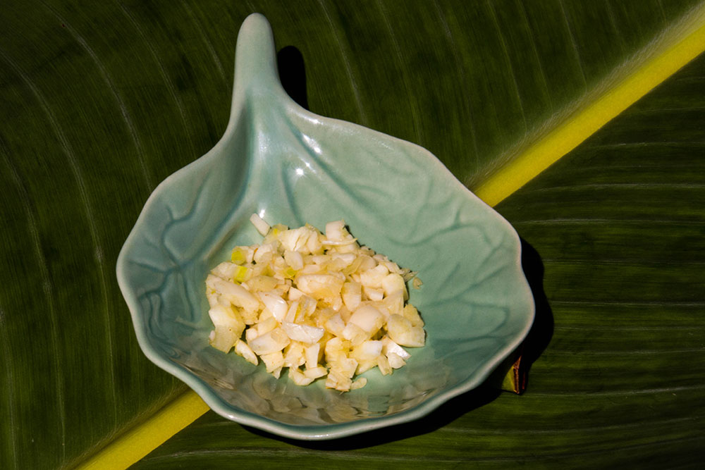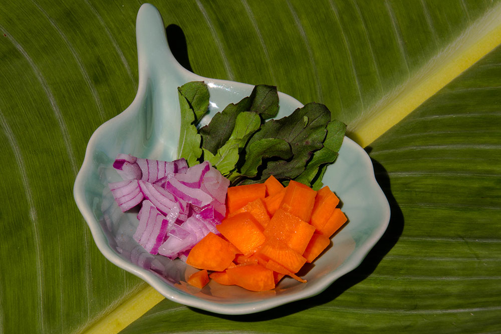 Set aside a little of the onion, carrot, and basil leaf for garnish