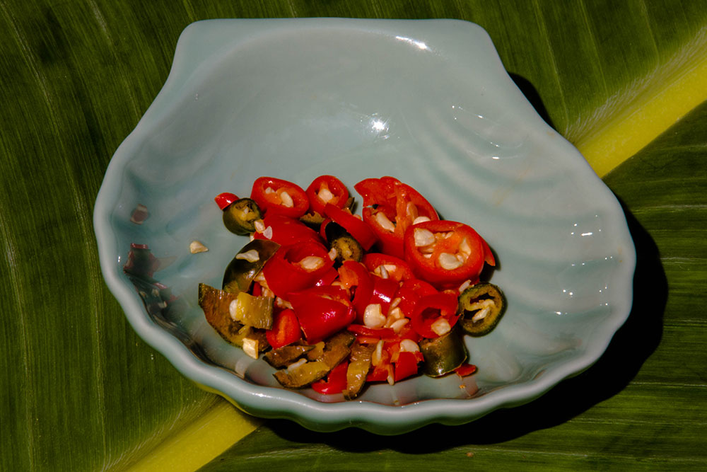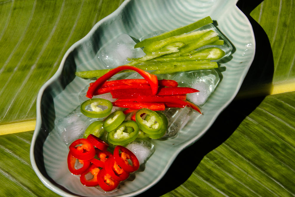 The big chilies are only for decoration. Slice 1/2 small slices and 1/2 in small sticks. Do not use the seeds, or the dish gets too spicy. Place the sliced chilies on ice until you use it, then it stays crisp.