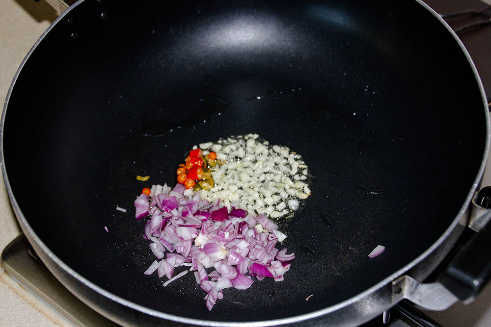 Then add garlic, onion, and only 1/2 of the chilies. You can add more chilies later, this way it is easier to control how hot the dish gets.