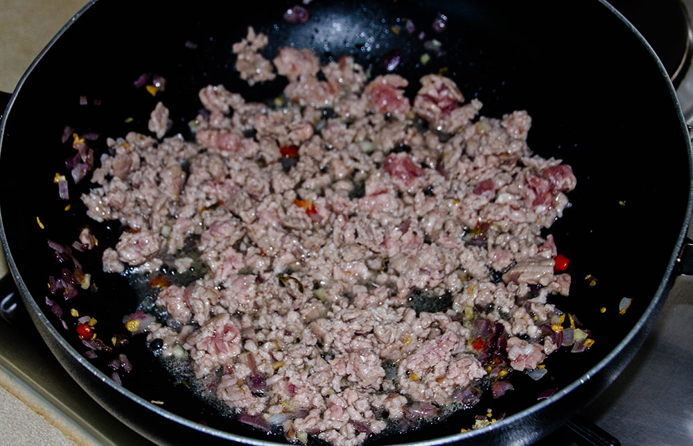 Typically Pad Krapow Moo is with pork. “Moo” means pork in Thai, but you can also use chicken, beef, or fish, depending on your preference. And the meat doesn’t need to be minced; you can also use meat chopped into small pieces.